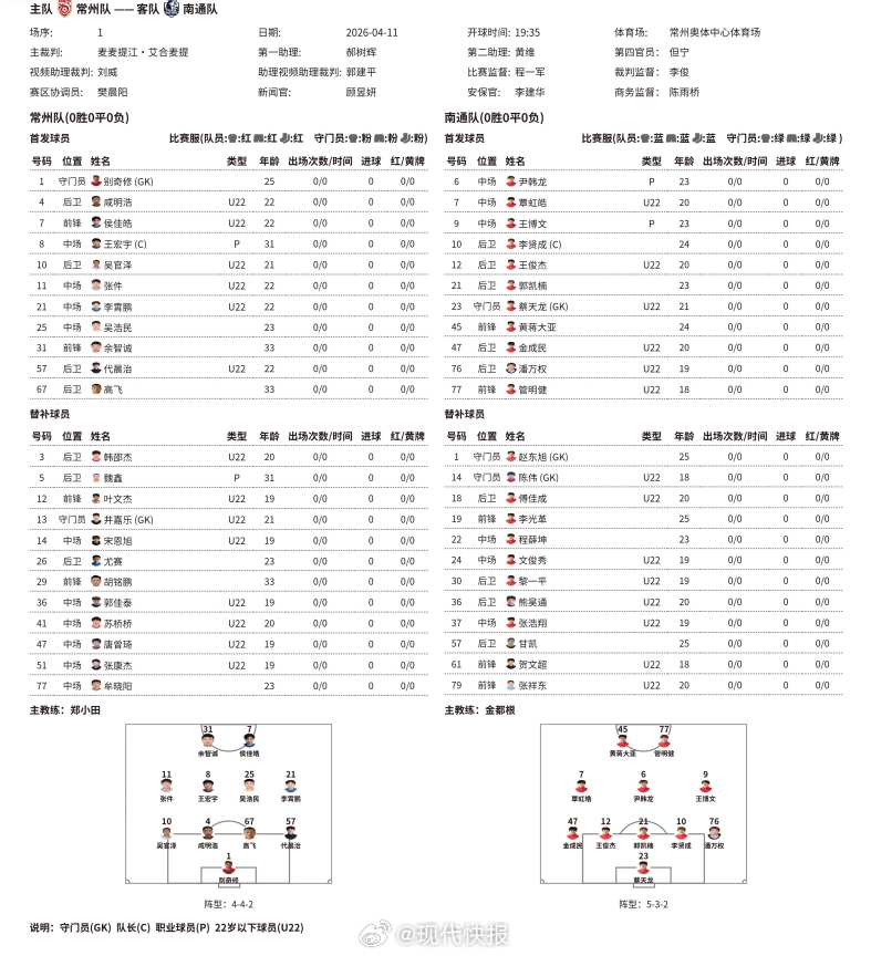 04月11日讯 北京时间19点35分,2026江苏省城市足球联赛(苏超)第1轮揭幕战,常州队坐镇主场常州奥林匹克体育中心对阵南通队。赛前双方首发公布!